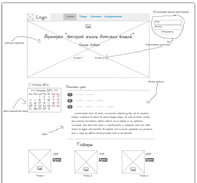 Необходимо было разработать сайт на тему проведения детской ярмарки "Базар добра" и упаковать продукт
